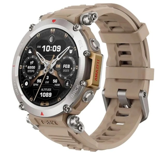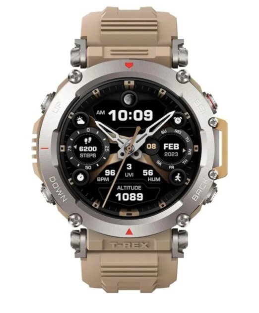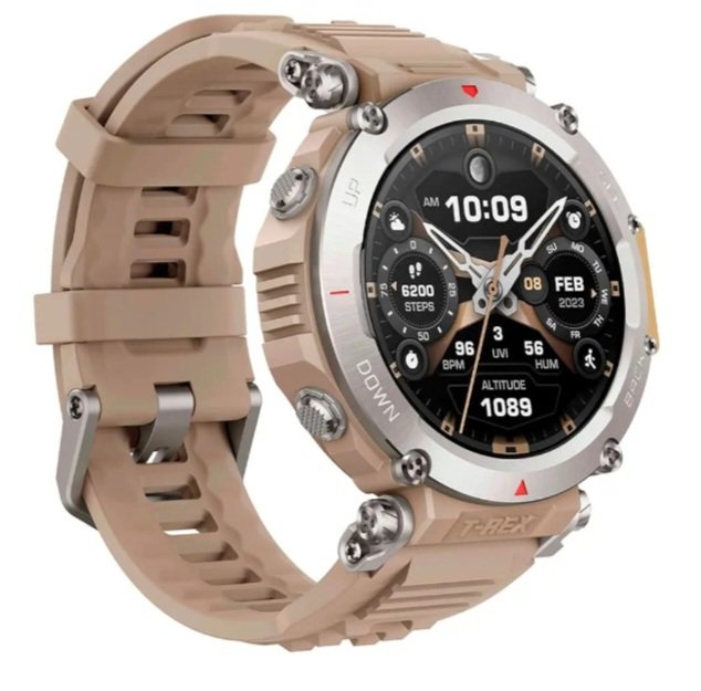 Amazafit smart watch in sahara colour. 316L stainless steel , mud resistant. HD AMOLED display can reach a peak brightness of 1,000 nits for ultra-clear visibility. 30m Freediving Support: As the ultimate multi-environment outdoor smartwatch, the Amazfit T-Rex Ultra supports indoor and outdoor freediving to a depth of up to 30 meters. It can also…